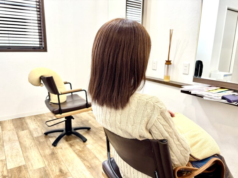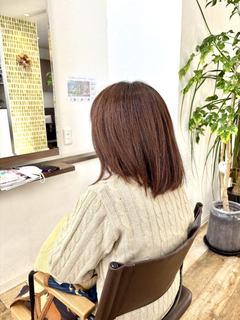 毛量は多めで、もともと赤みが出やすい髪質でして、さらにお肌が弱いこともあり、カラーは刺激をできるだけ抑えながら赤みを感じにくいブラウン系にマット系をミックスしたベースに調整しました。