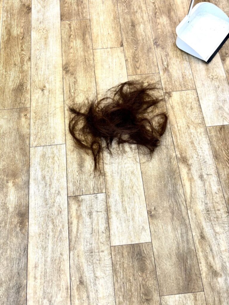 出産前にバッサリ切ったら、現在抱っこする時に髪が引っ張られて邪魔っという事もあり、伸ばしている途中で一番気になりやすい「量」と「広がり」を中心に必要なところだけを適量に減らしていきました。