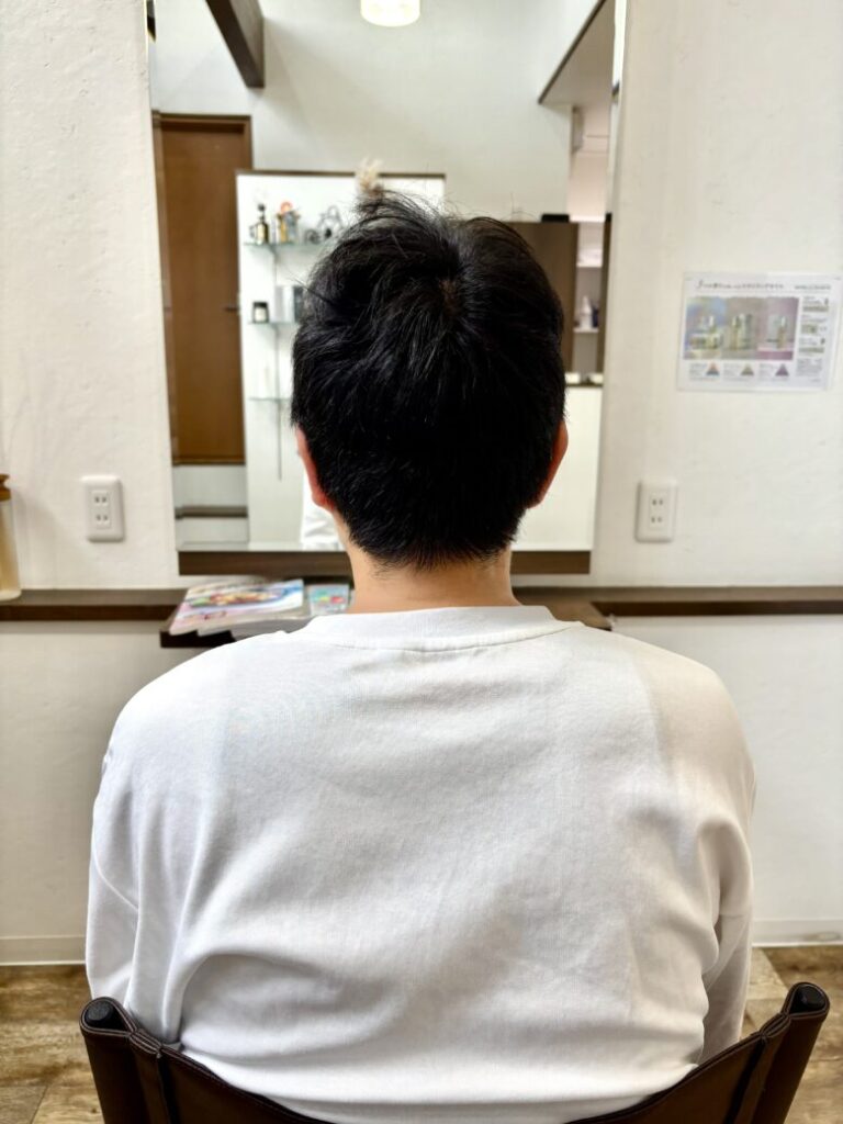 中はツーブロックにしてサイドのボリュームが抑えて上の毛をかぶせると切ったなりは頭の形もきれいに見えるんです。