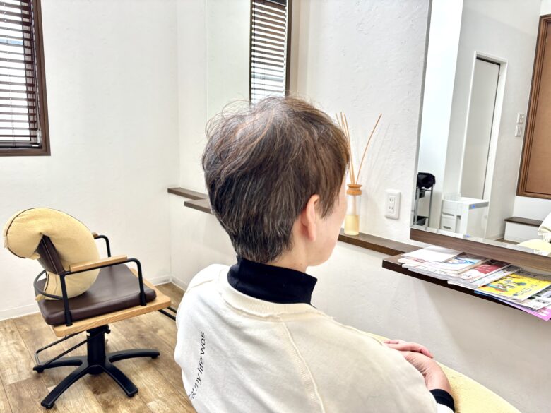 えり足などのクセが一番強く出ている部分はすっきりさせて首元をきれいに見せつつ、トップにはほどよく長さを残してやわらかさを出しています。