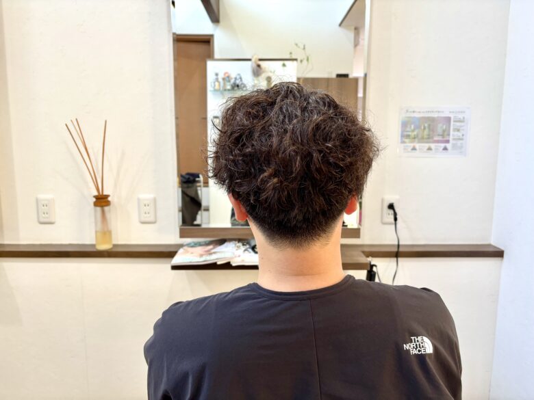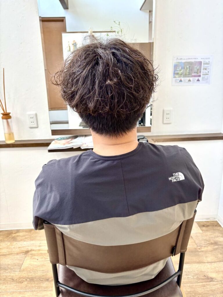 では今回も周りをツーブロックでスッキリと刈り上げ、トップにはしっかりめのシャドウスパイラルパーマをあてていきましょう!