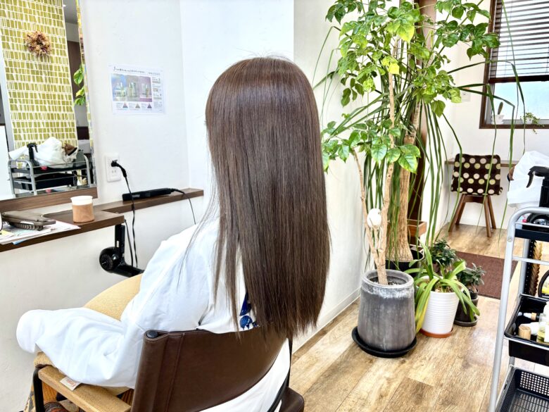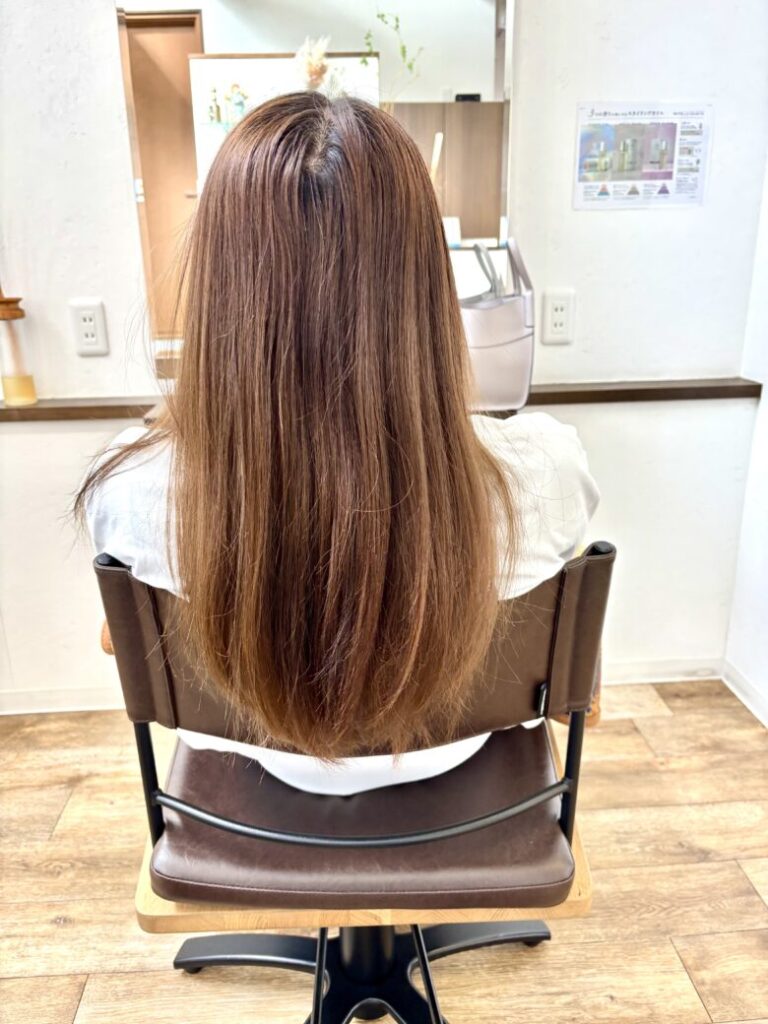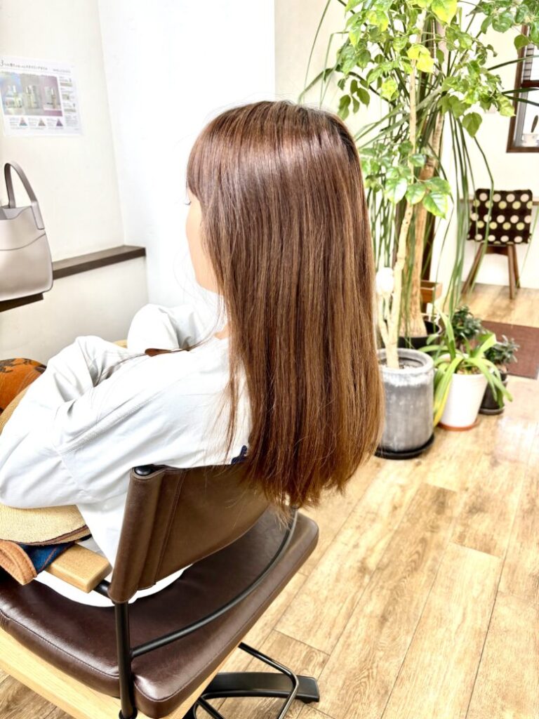 この季節、頻繁にゴルフコンペが多いそうなので紫外線のダメージや今までのブリーチで乾きやすくなっていた毛先も、うるっとまとまるツヤ髪にリセットされました!