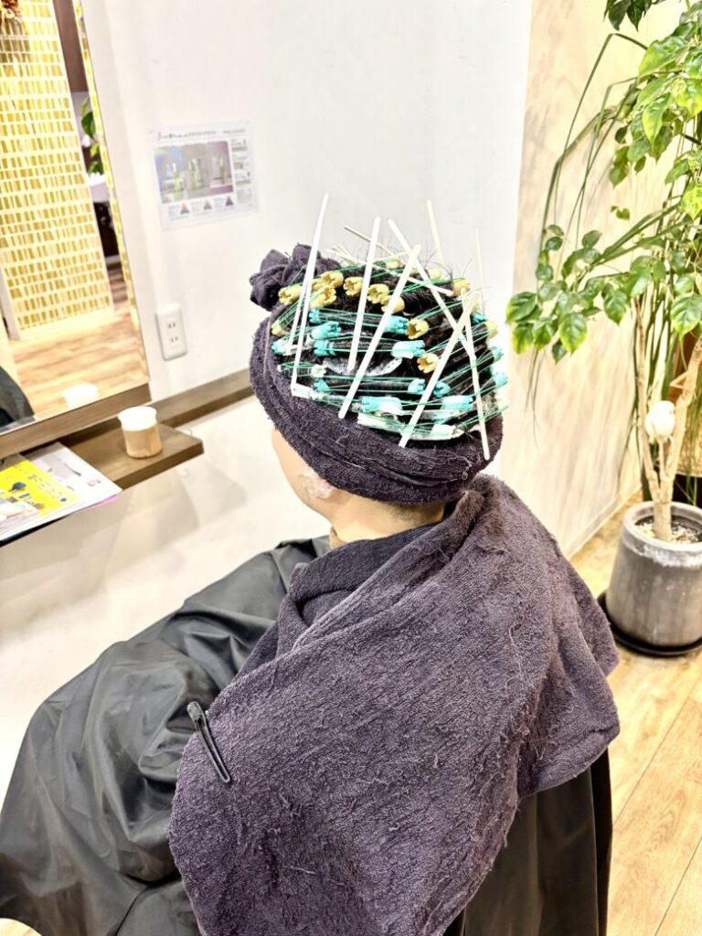 一旦硬い髪を軟化させてからロッドを巻いていきます☟