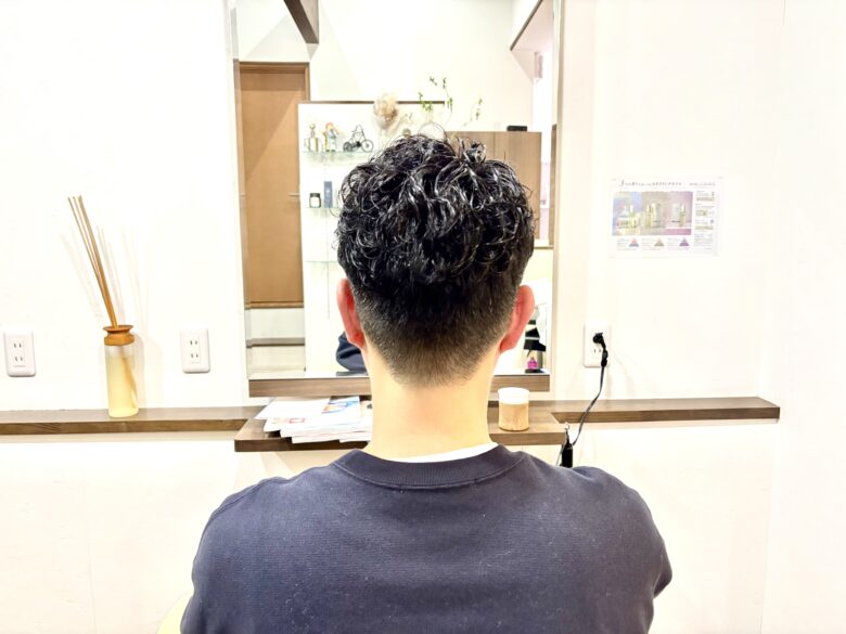 こんな感じのパーマは横のボリュームが気になる方にも、強めパーマをあてた内側をツーブロックにして無くすことで逆にバランスが整いやすくなるのでおすすめです。
