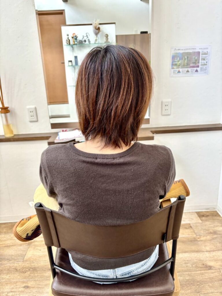 境目も自然になじむように白髪染めと普通のカラーをミックスさせて、なるべく明るさお残しながらツヤと落ち着きをだしつつ全体がぐっと綺麗に見えて白髪もしっかり染まるように調整しました!