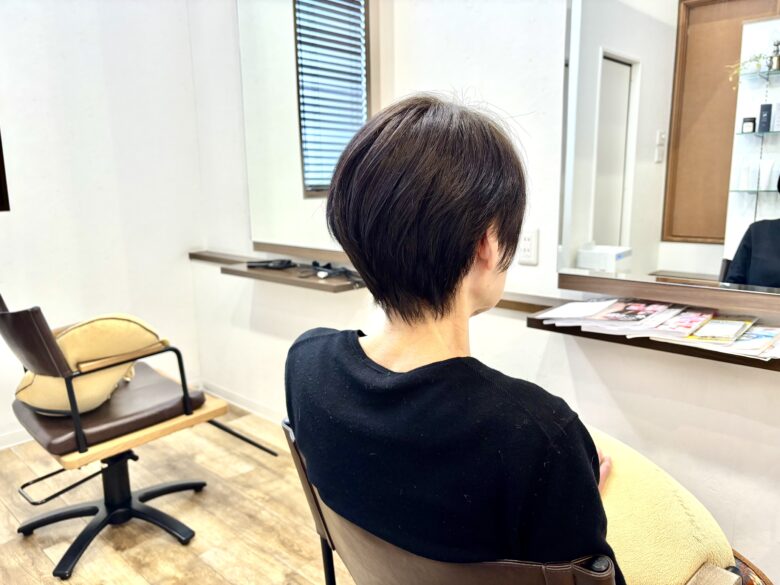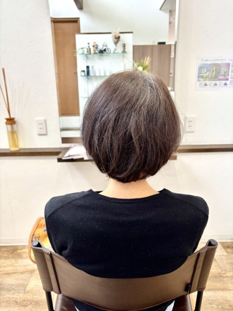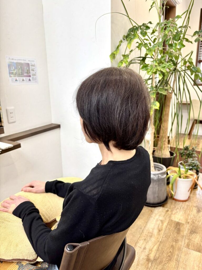 カラーは白髪染めで、明るさは今とほぼ変えずに暗くしすぎず、今の印象をキープしながら気になるところだけきちんとカバーしています。