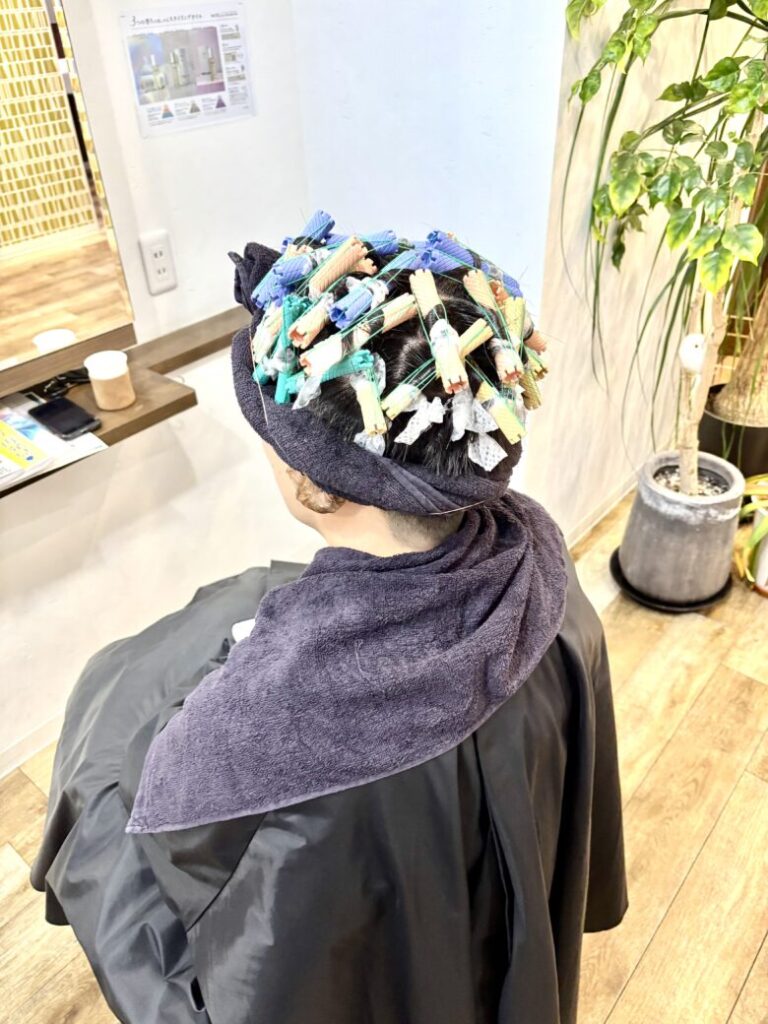 直毛でハリが強いため、そのままでは狙ったカールが出にくい髪質なので、今回もテシンクではお馴染みの一度しっかり軟化処理を行ってから施術ですね~