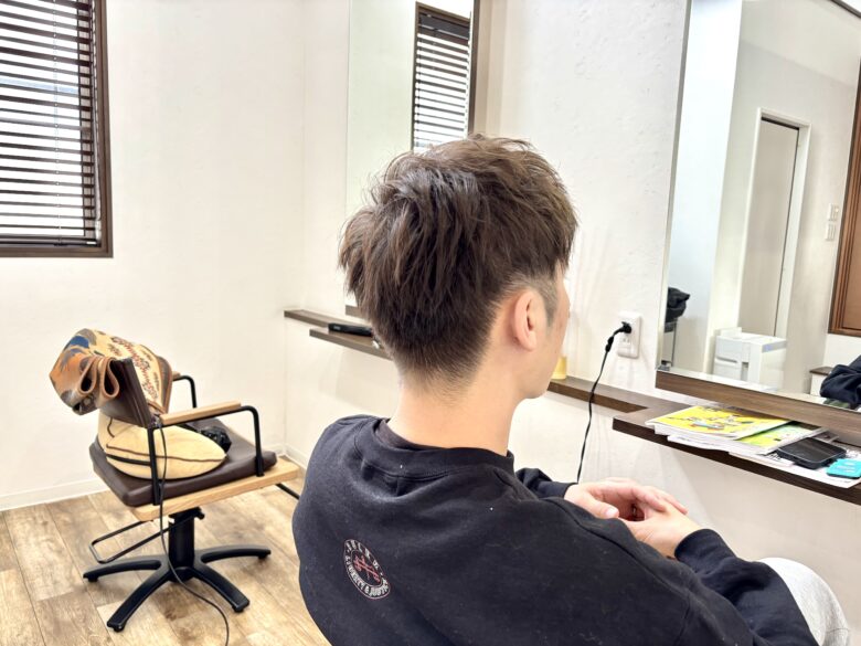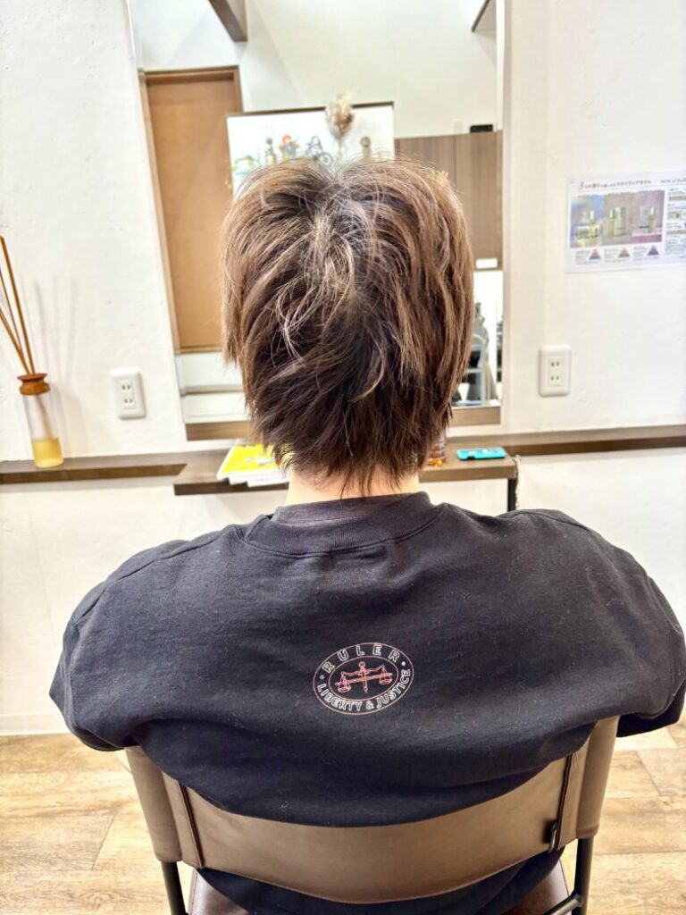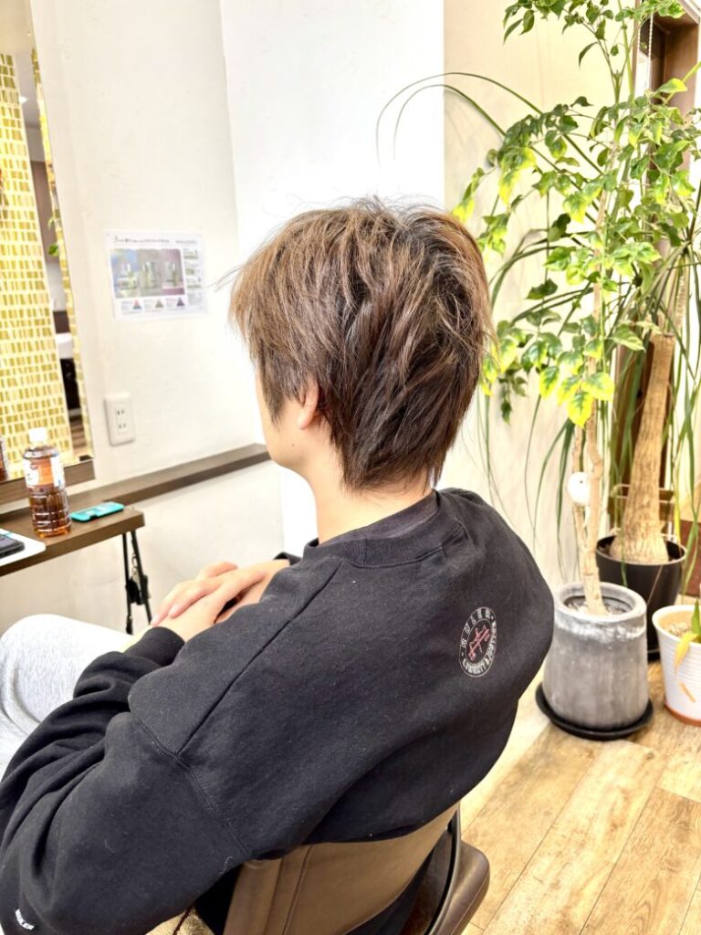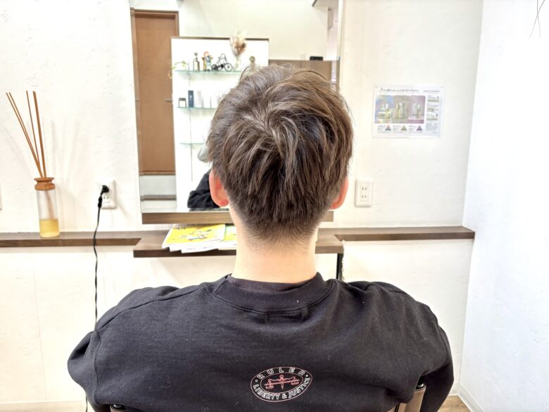 耳周りや襟足は軽く刈り上げて、全体のシルエットが締まりつつ、トップの束感が出やすいようにしました。